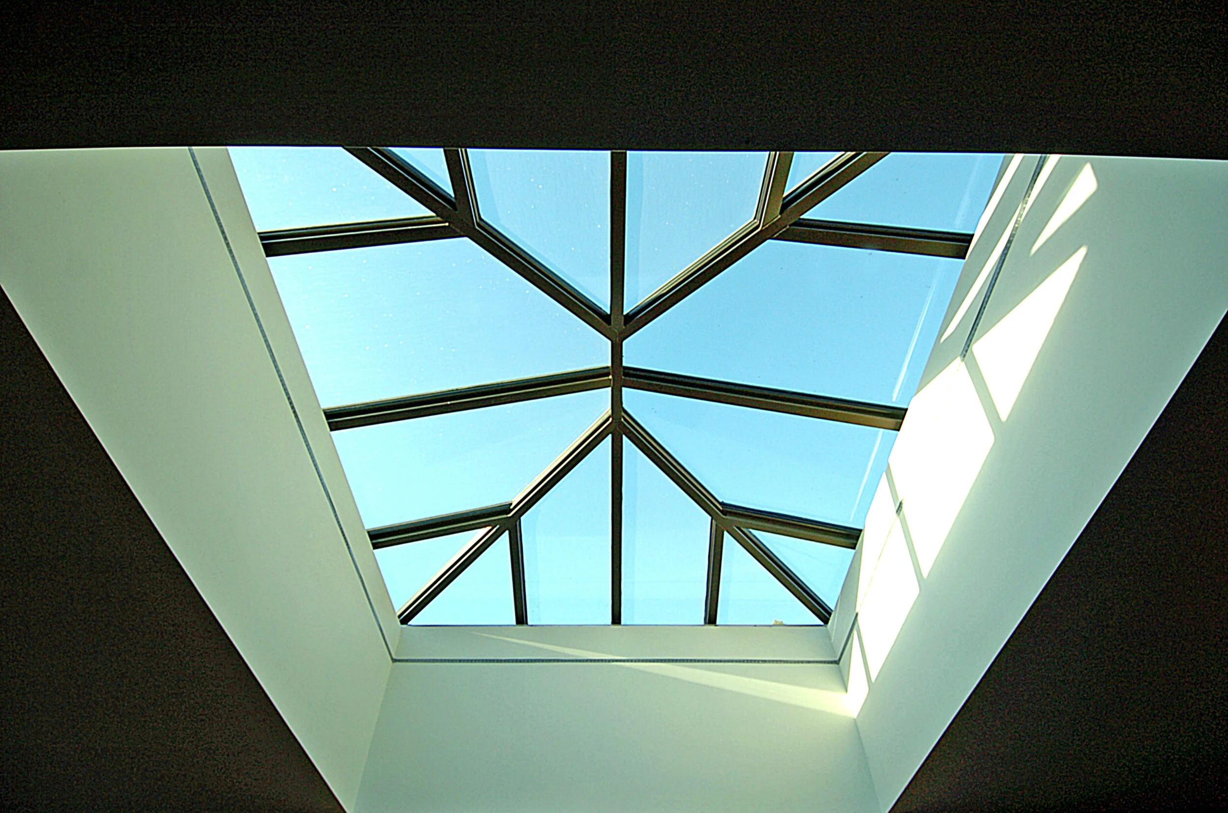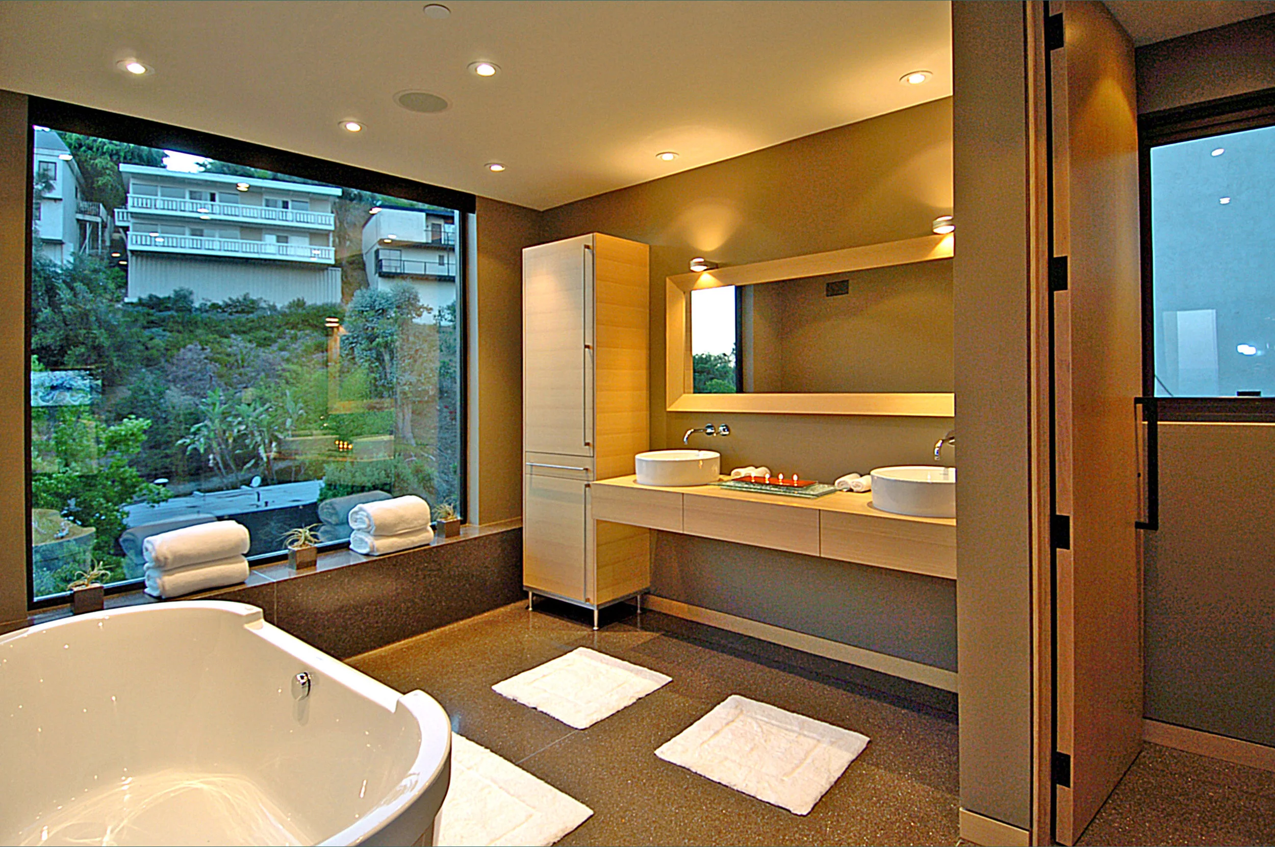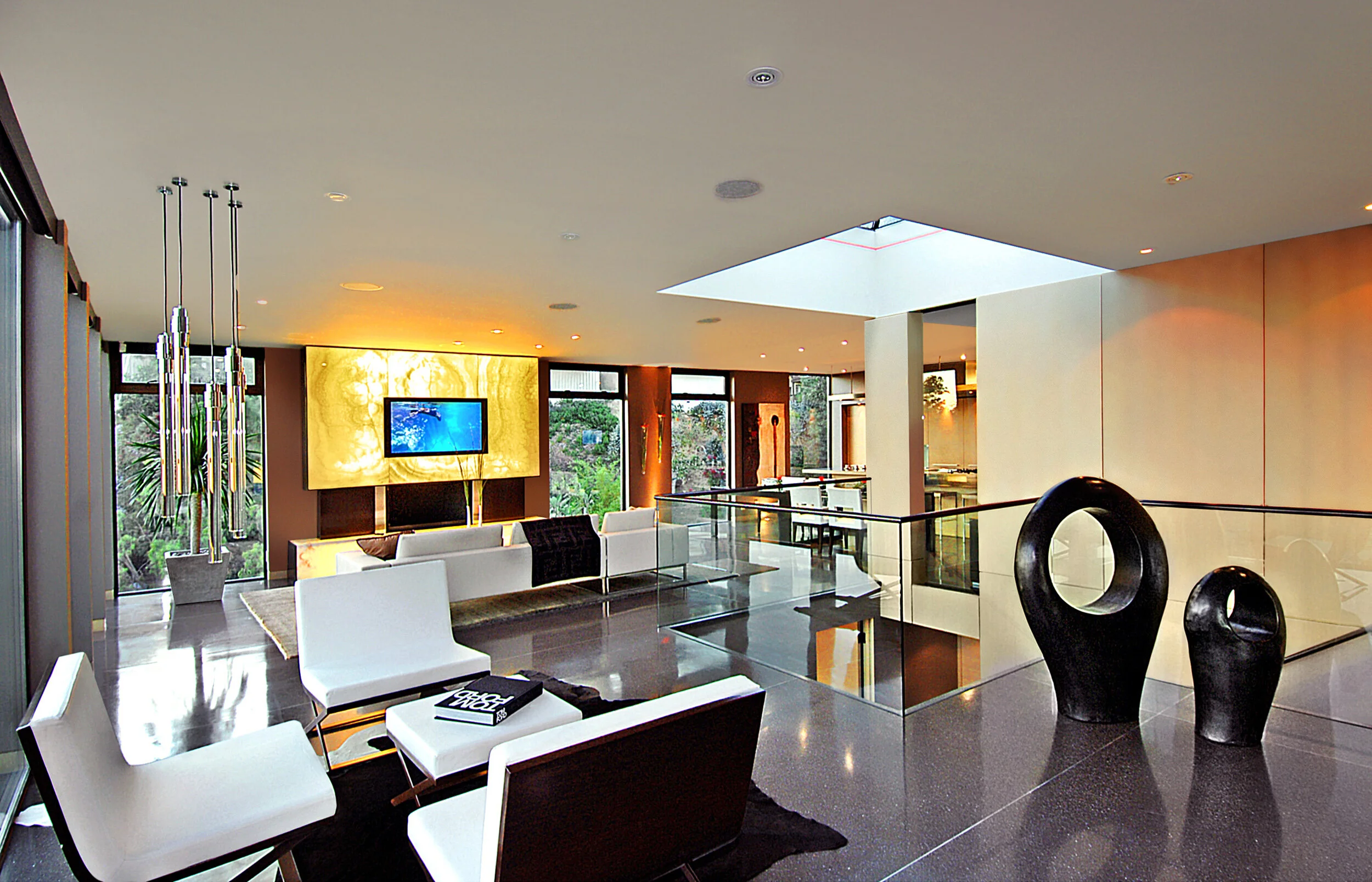Inside, contrast continues with the silky onyx and dramatic black used in both fireplaces. The onyx is lit from behind, creating a golden glow. Extensive use of polished wall tile, stone, terrazzo flooring, and glass brings an airy crispness to the design, and bold tiles by Ann Sacks and Walker Zanger enliven the baths.
