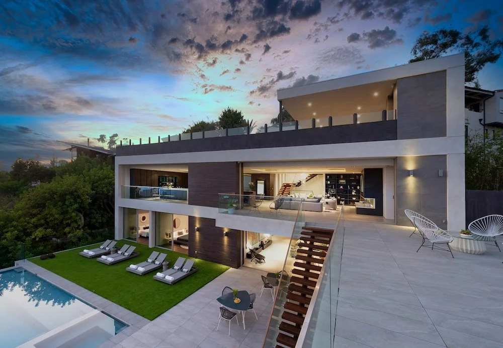 Each terrace is the roof of the level below it, a modern California interpretation of the terraced hillsides that overlook the Mediterranean Sea. Marc explains,“Terracing down the hillside worked well on this property, stacking the floors on top of one another maximizes the glass area and obviously the exposure to the view.” And these views include the iconic Hollywood sign and Downtown Los Angeles.