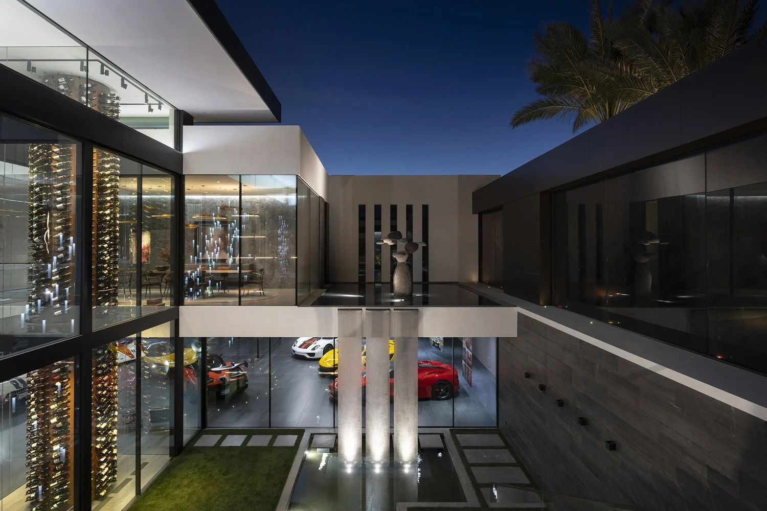 Serenity Indian Wells luxury desert mansion with custom 28' tall rotating refrigerated wine tower for modern wine display