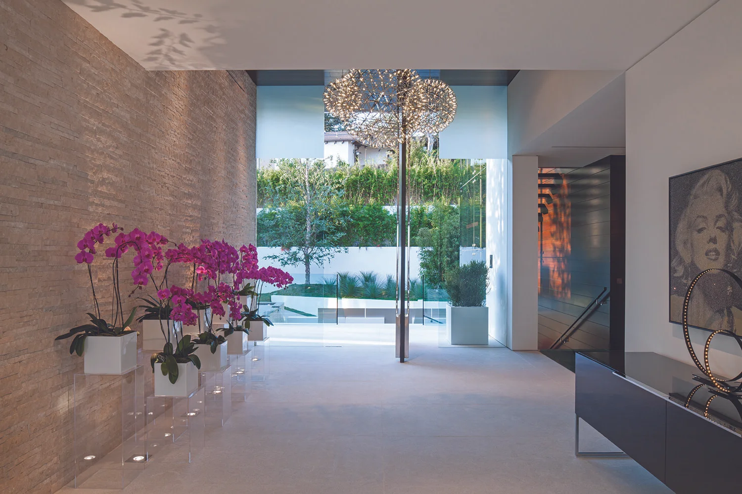Modern glass wall foyer with chandelier & orchid display at Laurel Way luxury home in Beverly Hills