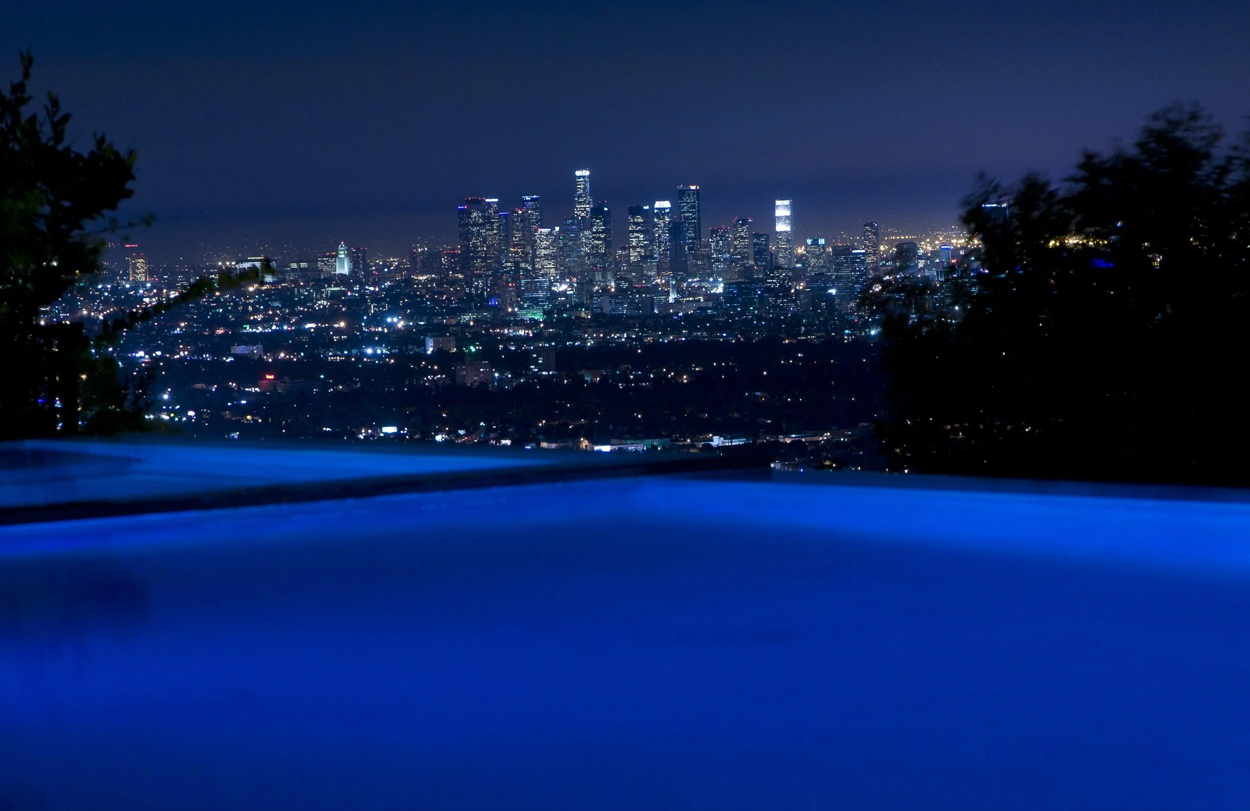 Calm infinity edge pool at Los Tilos luxury home overlooks the Los Angeles city skyline from high up in the Hollywood Hills